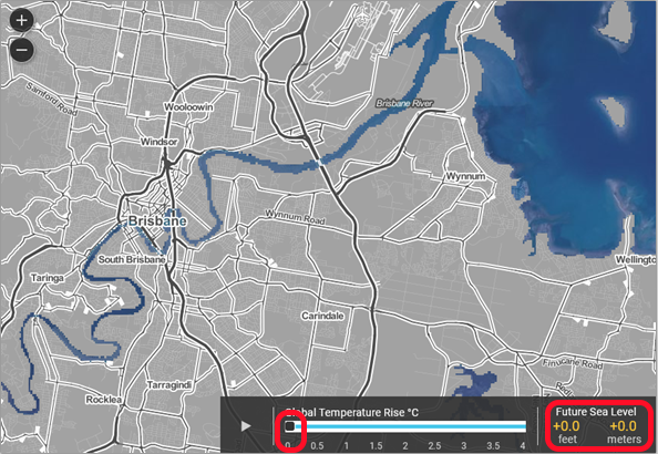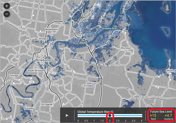 A model can be used to predict more direct and local consequences of events. Figure 6 is a map indicating sea level rise based on global temperature rise and the resulting flooding in Brisbane Australia. This particular model allows the user to choose a geographic location and global temperature rise to see the impact on that city. It ties together predictions of what the sea level rise would be due to ice melt and thermal expansion of oceans at various temperatures which incorporates very complex mathematical models and physics; and the coastal implications based on elevation above current sea level. The result is very simple to understand for the general public.