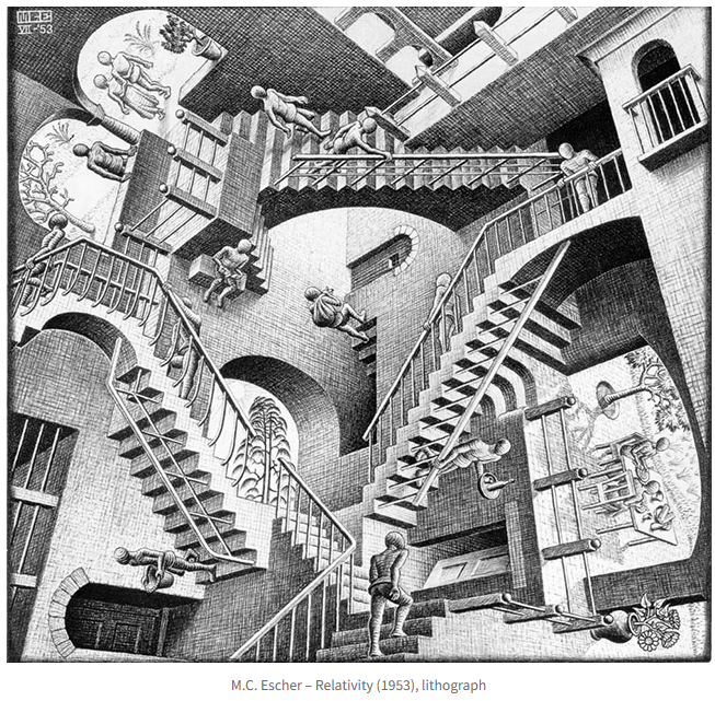 Figure 7 would mean absolutely nothing to most people, what is a field equation to start with!!! But it provides precision and accuracy and helps explain the subtlety in the orbit of the planet Mercury that Newtonian gravity could not. Even with that simple explanation figure 7 is totally meaningless to mere mortals. The visual model of figure 8 is something that more people could at least grasp the concept, even if they are somewhat challenged in a practical sense. In this model the reason that Mercury is so recalcitrant is not obvious. We also live our daily lives in a space and time context as per Mr Newton, not a spacetime context as Mr Einstein! Figure 9 being an artistic model may only place a smile on one’s face, but on deeper reflection it does convey ideas of things being relative to others and maybe not as they appear initially to the senses. It has been described as Visual imagery of a world where the laws of gravity have ceased to exist. (Relativity, n.d.) Or at least laws of gravity not being what we normally think it to be. Could this be a catalyst for some inquiring mind? This line of thought will be followed up in future sections on this site.